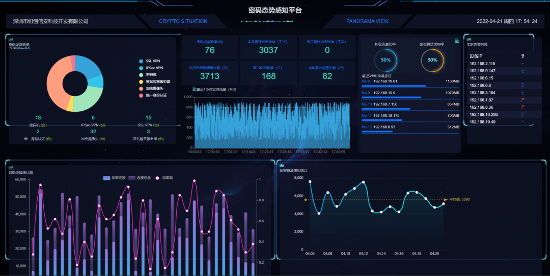 平台采用密码设备自动感知和密码设备流量识别等技术,可实现对服务器密码机、签名验签服务器、时间戳服务器、安全认证网关等商用密码资源的实时监测分析。