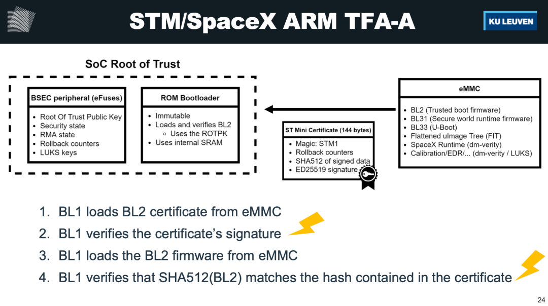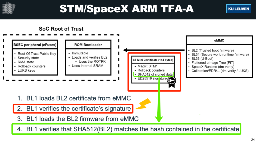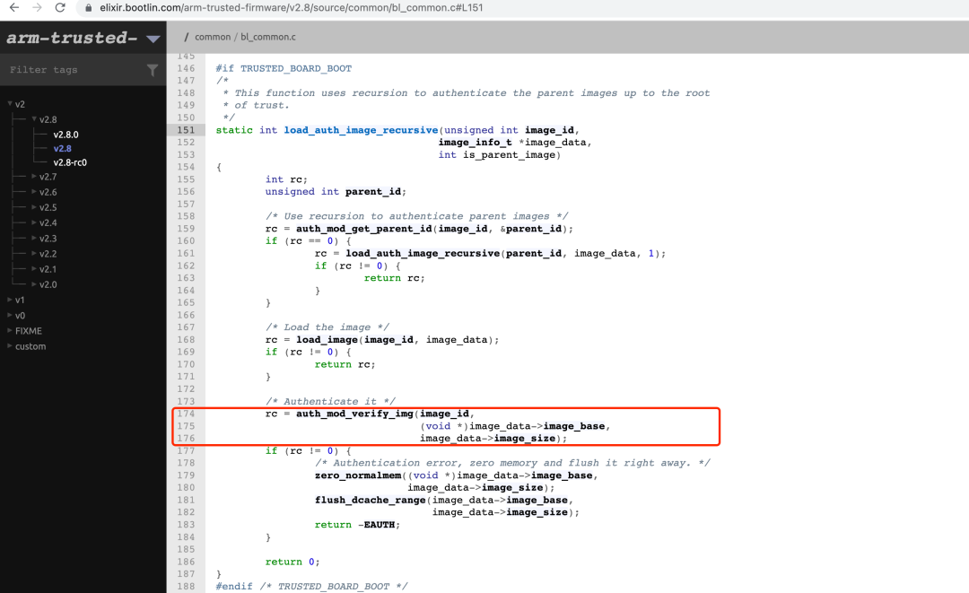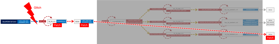 从原理上,整个破解的过程主要有两步,首先是先patch固件并烧写回FLASH,然后进行再故障注入。FLASH中固件的组织方式可以参考:SpaceX StarLink 星链卫星固件提取研究[21],可见其安全启动的实现就是开源的TF-A(也即ATF),经过分析我们确认了他的具体打法: