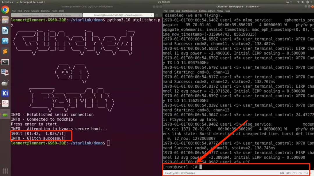 Lennert Wouters通过替换固件并进行故障注入,最终在本地拿到了锅盖的root shell: