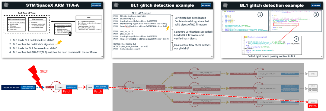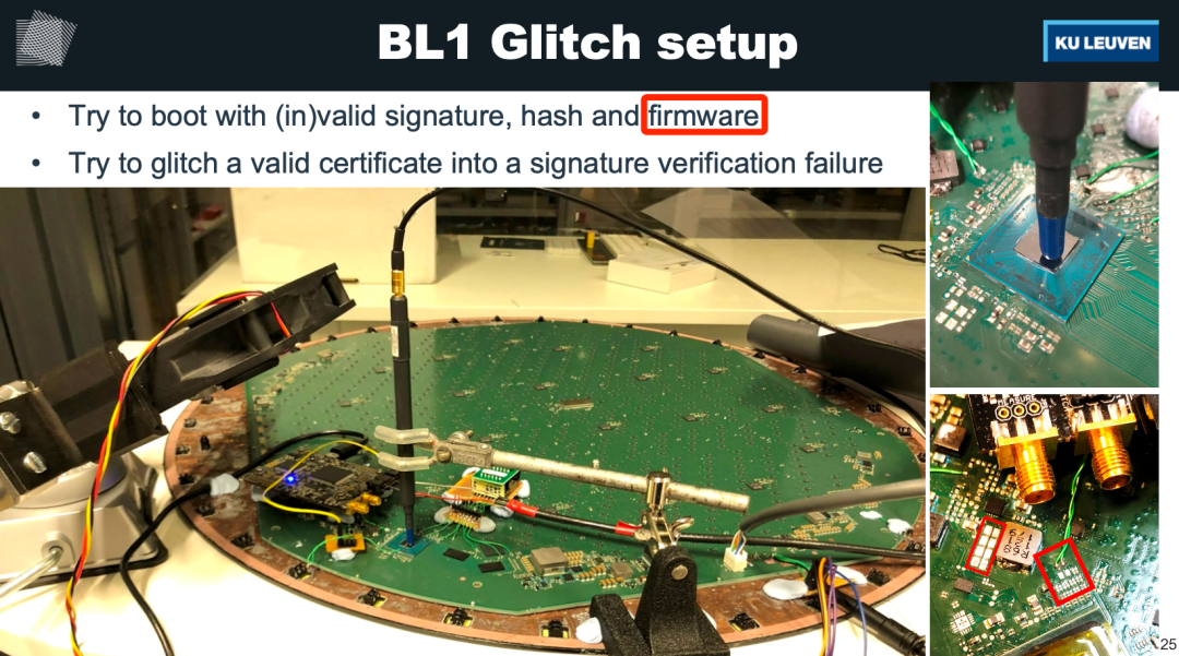 • 利用方法:烧写flash替换固件,并进行电压故障注入攻击BL1的启动校验